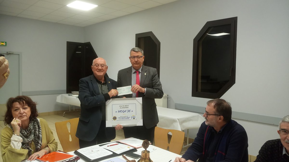 Lors de sa visite au Club de DEOLS ABBAYE, le Président de Lions ALZHEIMER, le Dr Jacques MARTIN au eu le plaisir de remettre à Robert LONGEIN, Président du Club un chèque de 700 euros bouclant ainsi financièrement le projet d'un halte relais avec des ateliers d'activités destinés au malades d'Alzheimer. Ce beau projet porté par l'Association YACQA 36 à Chateauroux permettra d'apporter un soutien réel et bien concret aux aidants des malades. Une jolie plaque à installer sur la halte relais accompagnait la subvention remise par Lions Alzheimer.